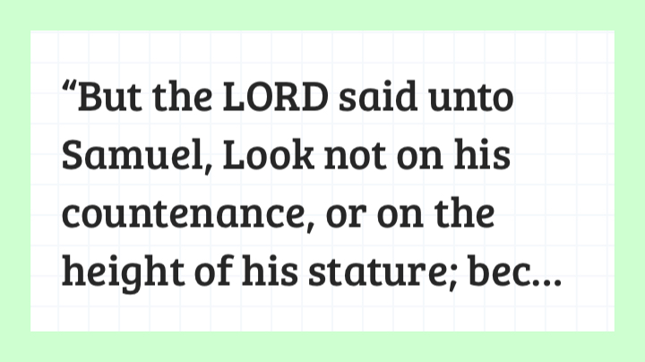 “But the LORD said unto Samuel, Look not on his countenance, or on the height of his stature; because I have refused him: for the LORD seeth not as man seeth; for man looketh on the outward appearance, but the LORD looketh on the heart.” 1 Samuel 16:7 KJV https://bible.com/bible/1/1sa.16.7.KJV “Judge not, that ye be not judged. For with what judgment ye judge, ye shall be judged: and with what measure ye mete, it shall be measured to you again. And why beholdest thou the mote that is in thy brother's eye, but considerest not the beam that is in thine own eye?” Matthew 7:1-3 KJV https://bible.com/bible/1/mat.7.1-3.KJV