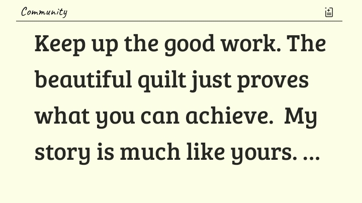 Keep up the good work. The beautiful quilt just proves what you can achieve. My story is much like yours. As a child I was bullied so I turned to myself. I fell in love with teaching myself to sew, knit & crochet. I'm 77 & been sewing 70 yrs. Collect sewing machines & quilt daily.