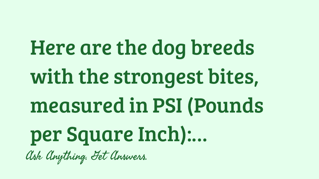 Here are the dog breeds with the strongest bites, measured in PSI (Pounds per Square Inch): Kangal Shepherd Dog (743 PSI): Known as the most powerful, they have the highest recorded bite force of all canine breeds. Bandog (730 PSI): A strong guardian breed known for its protective nature. Cane Corso (700 PSI): An Italian mastiff type used for guarding, boasting incredible jaw pressure. English Mastiff (556 PSI): Known for their massive size and, consequently, high bite force. Tosa Inu (556 PSI): A large, powerful, and rarely seen Japanese dog breed. Dogue de Bordeaux (556 PSI): French mastiffs with very strong, broad jaws. Presa Canario (540 PSI): A large, muscular, and territorial Spanish breed. Dogo Argentino (500 PSI): A powerful white dog bred for hunting. Wolfdog (406 PSI): A hybrid, often inheriting strong, wild-type jaw pressure. Rottweiler (317-328 PSI): A popular working dog with substantial, crushing power. American Bulldog (305 PSI): A stocky, strong, and active breed. German Shepherd (238 PSI): A versatile working dog, often utilized in protection. American Pit Bull Terrier (235 PSI): Known for being tenacious, with a high bite force relative to their size. Factors Influencing Bite Force Purpose: Many of these breeds were developed for guarding livestock, hunting large game, or protection, requiring immense, bone-crushing strength. Size and Structure: Larger, mastiff-type dogs with broad heads and strong muscles generally have higher PSI. PSI vs. Aggression: A high bite force does not necessarily mean a dog is aggressive; many of these, including the Kangal, are known for being gentle with their families.
