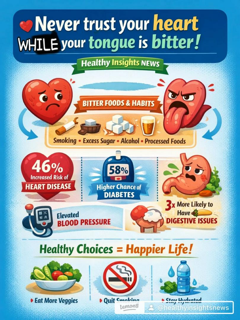Get Inspired - Health Insights - The Power of Your Taste Buds It’s your favorite health revolutionary storytelHER with a very interesting twist to unlock a healthier you: The Power of Your Taste Buds! Did you know your tongue might hold the key to your heart health? Research shows that bitter foods can indicate deeper issues with our hearts and overall well-being. Here are some biohacking tips to help you make healthier choices: 1. Reevaluate Your Diet Incorporate more bitter foods like kale, arugula, and dandelion greens to enhance your heart health. 2. Reduce Risk Factors Quit smoking to dramatically lower your risk of heart disease and high blood pressure. 3. Stay Hydrated Drink plenty of water; hydration affects everything from digestion to heart function. 4. Limit Processed Foods Cut back on sugar, alcohol, and processed items to curb the risks associated with heart disease and diabetes. 5. Boost Your Veggie Intake Add more veggies to every meal for essential nutrients that support your heart and overall health! Remember, healthy choices lead to a happier life. Share your favorite health hacks in the comments! Let’s inspire each other on the journey to better health. #Getinspired #inspiration #BreakingNews #HealthNews #Health #Biohacking #HotTopic #BodyHealth #healthyinsightsnews #comment #engaging