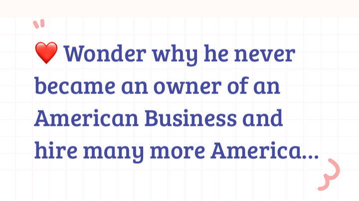 ❤️ Wonder why he never became an owner of an American Business and hire many more Americans ? I know that most people in Hollywood bad Mouth American Business …. Except the ones that Cater to them … like on Rodeo Drive . When I first got out of High School , I worked for an older Gentleman that made Custom Home & Business Windows & Doors … The place would buy all the different materials and do the entire Process in house . Even the installations were done by his Teams . That man would arrive every day first , he was always the last person that went home . Mr Ware … still has his Windows in some older Union Buildings in Downtown Miami ! Bet he died long ago . Honorable Men need remembrance !