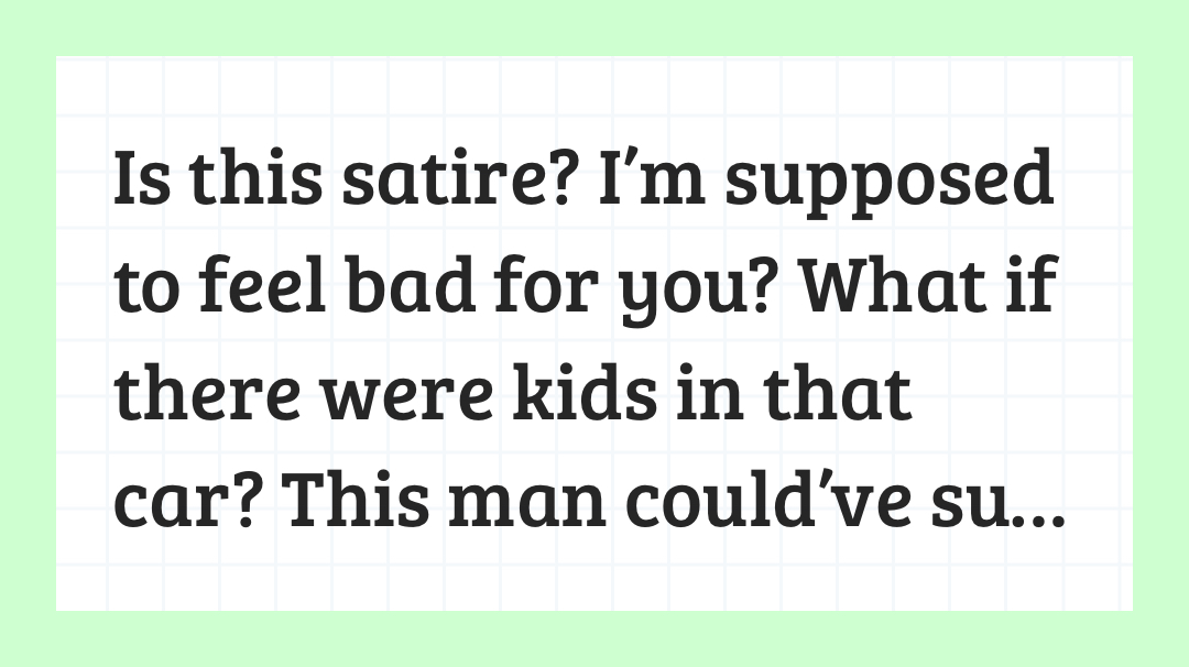 Is this satire? I’m supposed to feel bad for you? What if there were kids in that car? This man could’ve sustained serious injuries to where he was disabled. I don’t glance at my phone while driving. I set my music and leave it be. If I’m at a stop light I might take a second to change a song. This is why DND mode exists. You can even set your phone up to send messages to people that try and contact you “I’m driving I’ll call back soon”. Our phones have features to avoid this. People. Leave your fucking phones alone when driving. And you? How pathetic are you to come online and basically beg for pity for your own actions? That man better get a car soon. And I hope he went to the hospital. Bc I’ve been in an accident and I’ve had a fucked off back for over a decade. 👍🏼 sometimes needing emergency chiro intervention. Driving is not a game.