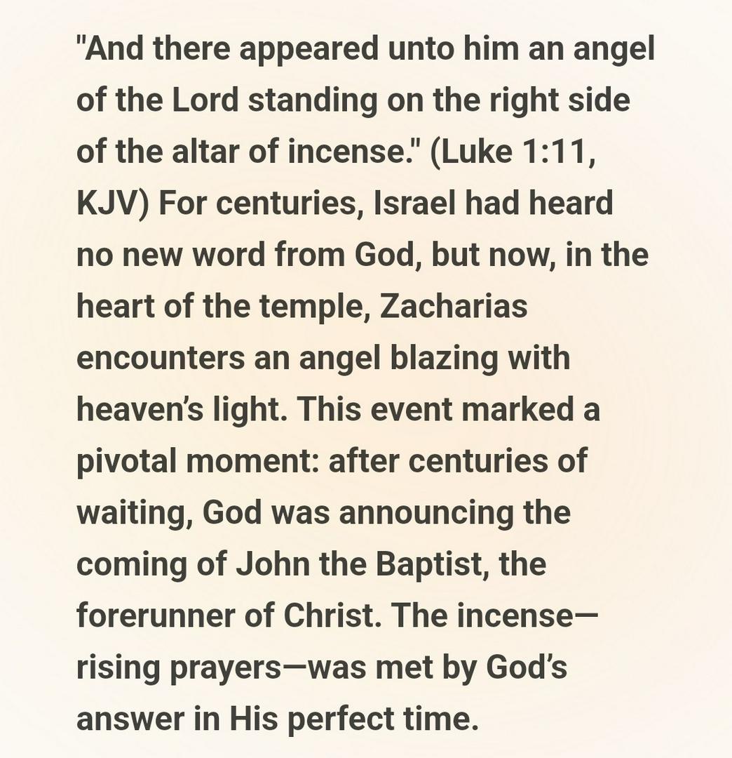 Luke 1:11 NIV [11] Then an angel of the Lord appeared to him, standing at the right side of the altar of incense.