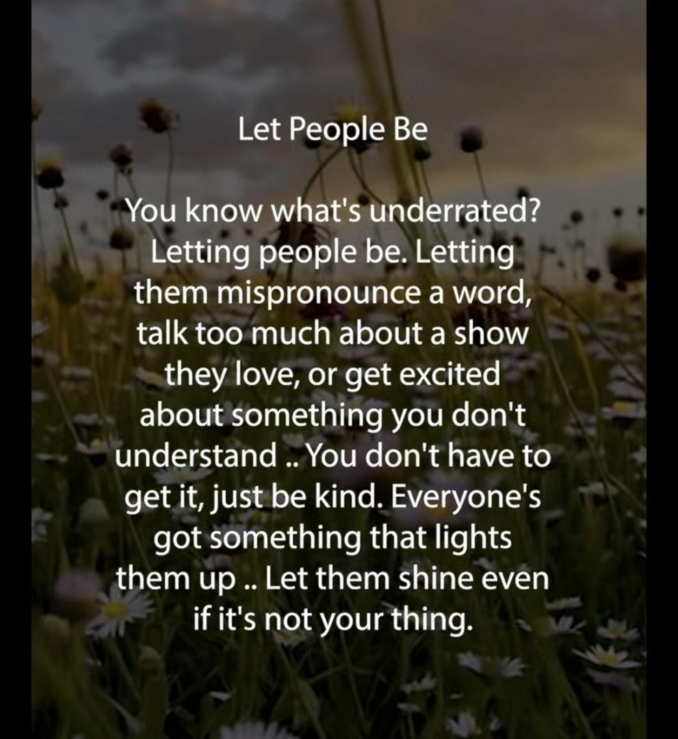 Let People Be You know what's underrated? Letting people be. Letting them mispronounce a word, talk too much about a show they love, or get excited about something you don't understand .. You don't have to get it, just be kind. Everyone's got something that lights them up .. Let them shine even if it's not your thing.