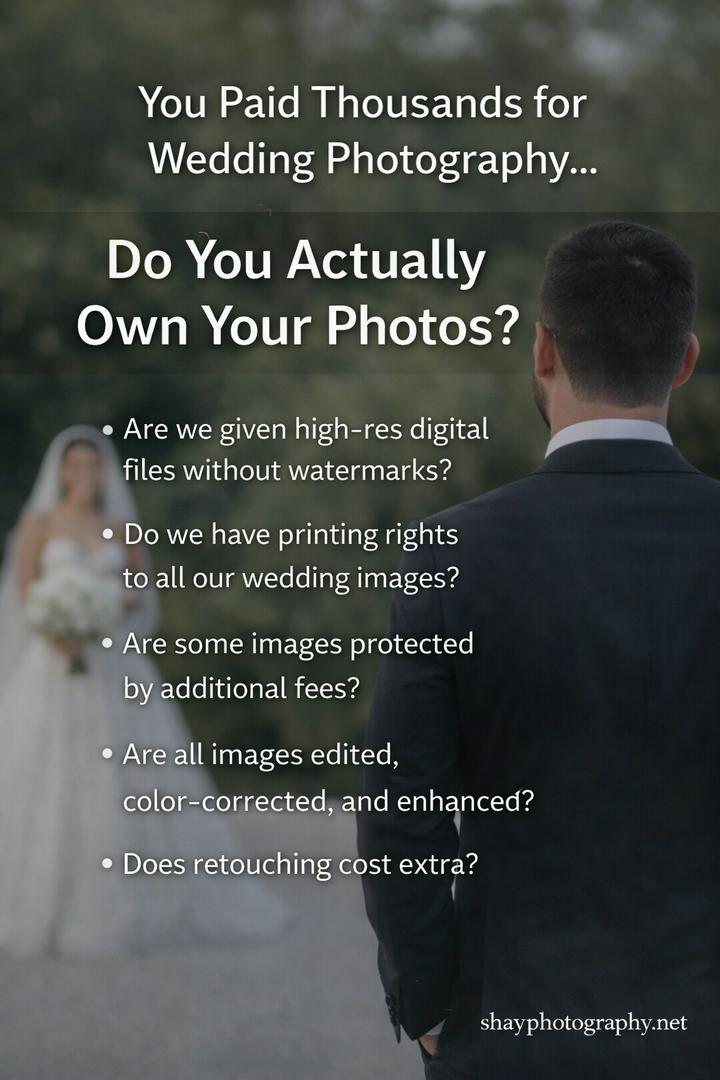 You Paid Thousands for Wedding Photography… Do You Actually Own Your Photos? This surprises a lot of couples. Many brides assume once they pay for a photography package, the images are theirs. Think again. In this industry, the photographer usually owns the copyright. That means companies can legally: • Charge for digital file downloads • Charge separately for printing rights • Restrict high-resolution access • Watermark previews until additional fees are paid • Set their own pricing for albums and prints Ever seen a bride post a low-resolution image or one covered in watermarks and wondered why? Often, it’s because downloading the full-quality digital file required an additional fee. And that’s not even touching printing rights. Some couples discover after the wedding that they don’t actually have permission to print wherever they want. They may be required to order directly through the studio at marked-up pricing. Those thousands you budgeted for your package? They may not include what you assumed. Before booking, ask clearly: Do we receive high-resolution digital files without watermarks? Do we have printing rights? Are there additional fees for downloads? Are all images edited, color corrected, straightened, and enhanced? What does retouching cost if needed? If those questions aren’t answered upfront, you could spend thousands more after the wedding just to access your own memories. Being in the industry for almost 20 years full-time as a professional photographer in the South Florida wedding industry as the owner of SHAY Photography, I’ve seen couples blindsided simply because they didn’t know what to ask. Clarity protects you. Fun should be the focus — not surprise invoices. shayphotography.net #weddinghacks #weddingtips #southfloridawedding #topreads