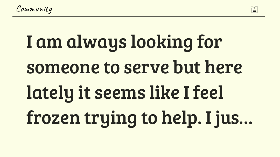 I am always looking for someone to serve but here lately it seems like I feel frozen trying to help. I just need guidence lord. Help me to help the least of these. That is my prayer.