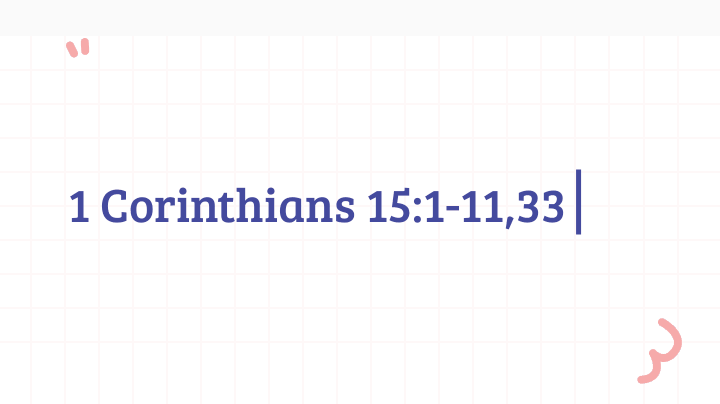 1 Corinthians 15:1-11,33 KJV Moreover, brethren, I declare unto you the gospel which I preached unto you, which also ye have received, and wherein ye stand; [2] By which also ye are saved, if ye keep in memory what I preached unto you, unless ye have believed in vain. [3] For I delivered unto you first of all that which I also received, how that Christ died for our sins according to the scriptures; [4] And that he was buried, and that he rose again the third day according to the scriptures: [5] And that he was seen of Cephas, then of the twelve: [6] After that, he was seen of above five hundred brethren at once; of whom the greater part remain unto this present, but some are fallen asleep. [7] After that, he was seen of James; then of all the apostles. [8] And last of all he was seen of me also, as of one born out of due time. [9] For I am the least of the apostles, that am not meet to be called an apostle, because I persecuted the church of God. [10] But by the grace of God I am what I am: and his grace which was bestowed upon me was not in vain; but I laboured more abundantly than they all: yet not I, but the grace of God which was with me. [11] Therefore whether it were I or they, so we preach, and so ye believed. [33] Be not deceived: evil communications corrupt good manners. Romans 3:23-25 KJV For all have sinned, and come short of the glory of God; [24] Being justified freely by his grace through the redemption that is in Christ Jesus: [25] Whom God hath set forth to be a propitiation through faith in his blood, to declare his righteousness for the remission of sins that are past, through the forbearance of God;