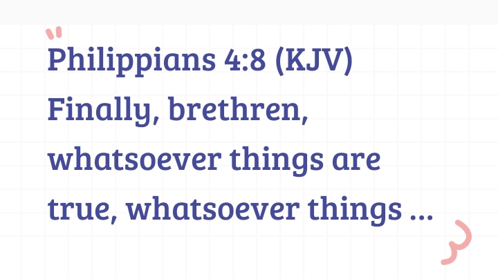 Philippians 4:8 (KJV) Finally, brethren, whatsoever things are true, whatsoever things are honest, whatsoever things are just, whatsoever things are pure, whatsoever things are lovely, whatsoever things are of good report; if there be any virtue, and if there be any praise, think on these things.