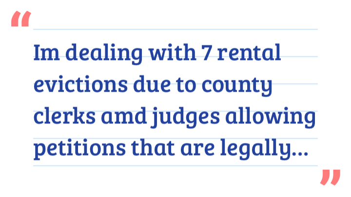 Im dealing with 7 rental evictions due to county clerks amd judges allowing petitions that are legally valid under uniform owner resident relations act to be immediately set up for trial amd summons same day as the fillings . Im victim to multiple eviction cases , code enforcement requests for investigations but misleading and false information has been entered in UHC 2026-0218 by Armando Apodaca