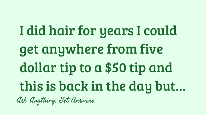 I did hair for years I could get anywhere from five dollar tip to a $50 tip and this is back in the day but every now and then I’d have my regulars that would come in on the weekend and they tipped me a dollar and I liked my tips that was always like oh thank you, but I was young and would get kind of an attitude, but that was all they can afford. They were old people lived on a fixed income, so you gotta figure out if they can afford it they could’ve barely afford getting their hair done so a dollar tip was just fine.