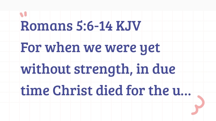 Romans 5:6-14 KJV For when we were yet without strength, in due time Christ died for the ungodly. [7] For scarcely for a righteous man will one die: yet peradventure for a good man some would even dare to die. [8] But God commendeth his love toward us, in that, while we were yet sinners, Christ died for us. [9] Much more then, being now justified by his blood, we shall be saved from wrath through him. [10] For if, when we were enemies, we were reconciled to God by the death of his Son, much more, being reconciled, we shall be saved by his life. [11] And not only so, but we also joy in God through our Lord Jesus Christ, by whom we have now received the atonement. [12] Wherefore, as by one man sin entered into the world, and death by sin; and so death passed upon all men, for that all have sinned: [13] (For until the law sin was in the world: but sin is not imputed when there is no law. [14] Nevertheless death reigned from Adam to Moses, even over them that had not sinned after the similitude of Adam's transgression, who is the figure of him that was to come. 1 Corinthians 15:1-4 KJV Moreover, brethren, I declare unto you the gospel which I preached unto you, which also ye have received, and wherein ye stand; [2] By which also ye are saved, if ye keep in memory what I preached unto you, unless ye have believed in vain. [3] For I delivered unto you first of all that which I also received, how that Christ died for our sins according to the scriptures; [4] And that he was buried, and that he rose again the third day according to the scriptures: Romans 3:23-25 KJV For all have sinned, and come short of the glory of God; [24] Being justified freely by his grace through the redemption that is in Christ Jesus: [25] Whom God hath set forth to be a propitiation through faith in his blood, to declare his righteousness for the remission of sins that are past, through the forbearance of God; ...