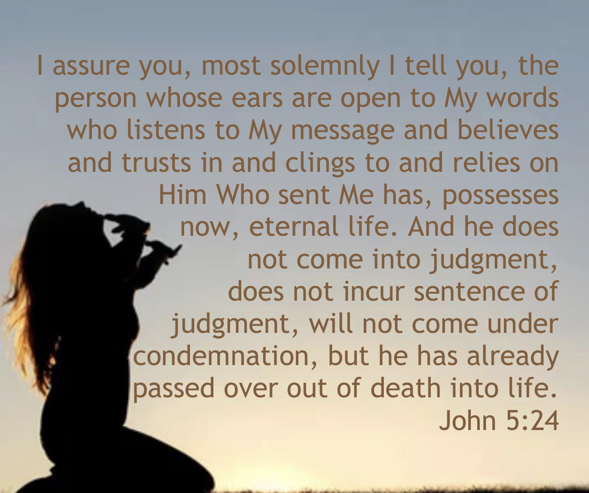 John 5:24 “The Son is able to do nothing of Himself, of His own accord; but He is able to do only what He sees the Father doing“… “The Father dearly loves the Son and discloses to Him everything that He Himself does“… “Just as the Father raises up the dead and gives them life, even so the Son also gives life to whomever He will“… “So that all men may give honor to the Son just as they give honor to the Father”. Jesus tells us, not only who He is but explains the relationship between Himself and the Father. He encourages us to listen to His message, to hear what He’s saying and believe. Those whose ears are open to His Words and believe in the One Who sent Him… now has eternal life. Does knowing we possess eternal life now change anything… how we live our lives? It’s not just a rack we hang our hope on… for future use, when we need it. Does it make more sense to live a spirit-led life, one where the flesh is under the control of the spirit … now? “Life is more important than food and the body is more important than clothes… ” and “…whoever wishes to save his life will lose it, and whoever loses his life for My sake, will save it”. Jesus is teaching what might be a hard thing about priorities… about faith, and trust and eternal life. Our miraculous, although temporary, bodies hold that which is eternal. Those who believe in and trust in God have eternal life. Knowing that changes who we are… our love, our patience, our compassion and mercy are reflections, imitations of the One Who gives us life, Who lives in us. Lord, we need You… Your Light, Your Life lives in us… help us to bring our flesh into obedience of the spirit. Thank you for glimpses of our eternity, help us to live as sons and daughters of the one true King. Help us to live in light of Your Truth.