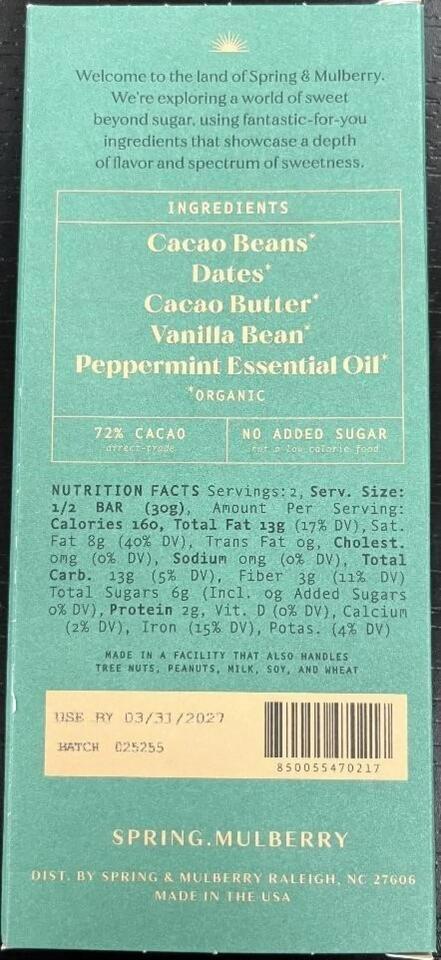 xwest+FollowChocolate Recalled Nationwide—Check Yours!Spring & Mulberry’s Mint Leaf Date-Sweetened Chocolate Bars are being recalled nationwide over possible salmonella contamination. If you bought one with lot code #025255, toss it and contact the company for a refund (just snap a pic of the code). No one’s gotten sick yet, but better safe than sorry! Salmonella can be nasty, especially for kids and older folks. Double-check your stash! #Health #BodyHealth #ChocolateRecall00Share