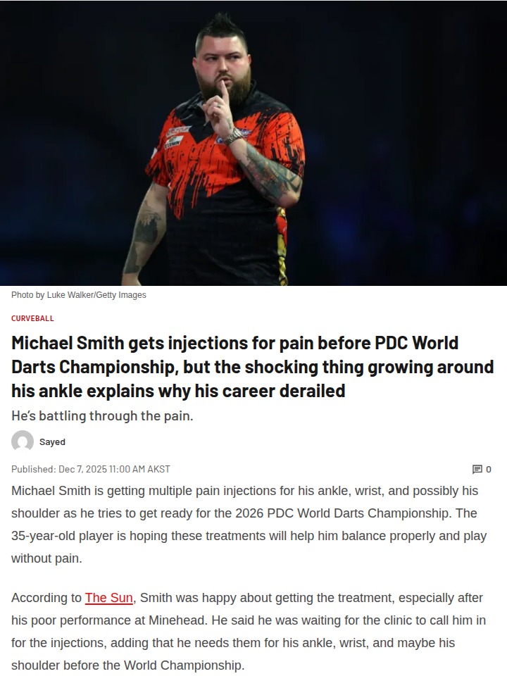 Judith Nelson+FollowBully Boy Battles Pain: Can Smith Return?Bully Boy fans, what do you make of Michael Smith’s latest injury saga? He’s getting pain injections for his ankle, wrist, and maybe even his shoulder before the 2026 PDC World Darts Championship. Turns out, it’s not just arthritis—there’s some wild bone growth around his ankle that’s derailed his game since his 2023 nine-darter glory. With Luke Littler now the youngest world #1, can Smith fight back and reclaim his spot at the top? #Sports #MichaelSmith #BullyBoy00Share