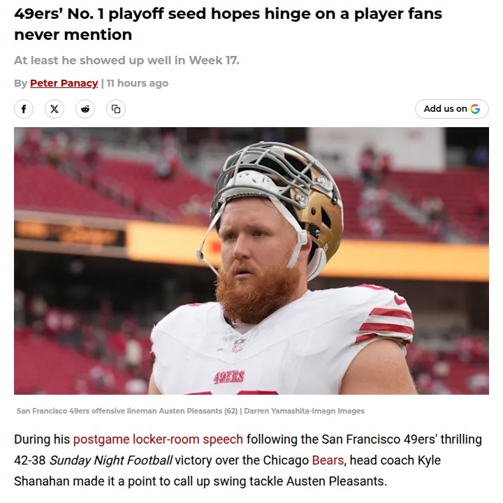 glen25+Follow49ers’ playoff dreams rest on an unsung heroSan Francisco’s shot at the NFC’s top playoff seed now rides on a name most fans barely know: Austen Pleasants. When star left tackle Trent Williams went down on the first play against the Bears, Pleasants stepped in and quietly held his own, helping the 49ers pull off a wild win. With Williams likely out for the crucial showdown against Seattle’s tough defense, Pleasants’ performance could make or break the team’s playoff path. Sometimes, it’s the least talked-about players who end up making the biggest difference. What do you think—can Pleasants keep the 49ers’ Super Bowl hopes alive? #Sports #Football #49ers00Share