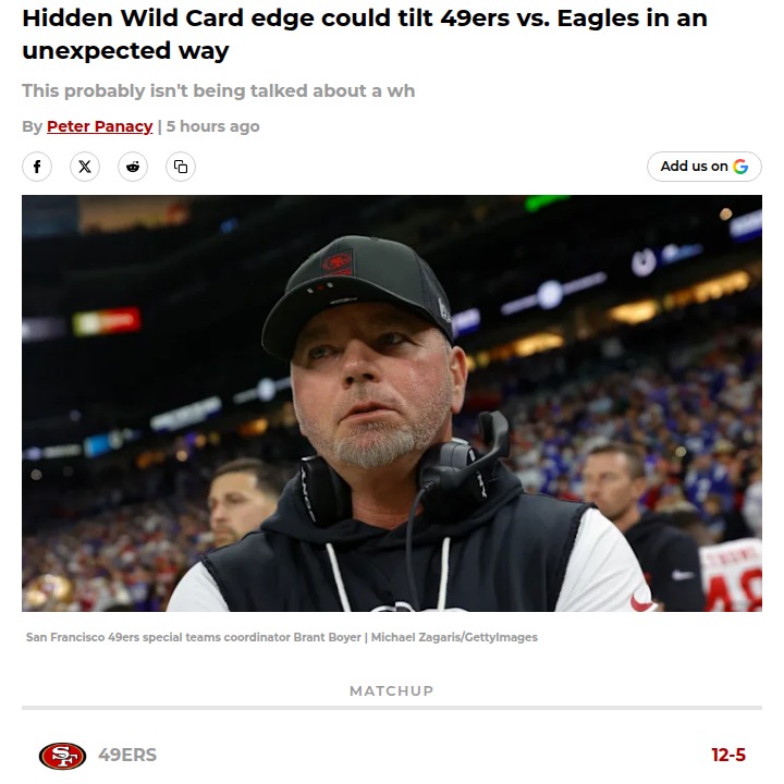 Jay Williams+Follow49ers’ Special Teams: The Secret Philly Edge?Faithful, don’t sleep on the third phase! While everyone’s talking about CMC and Hurts, the real Wild Card X-factor could be the Niners’ special teams. Remember that frozen Lambeau win? Since Week 11, Brant Boyer’s crew has quietly become elite, flipping field position and nailing clutch kicks. If the Eagles let Saquon run wild, it’ll be a grind—but our special teams might just tip the scales in San Francisco’s favor. Thoughts? #Sports #Football #49ers00Share