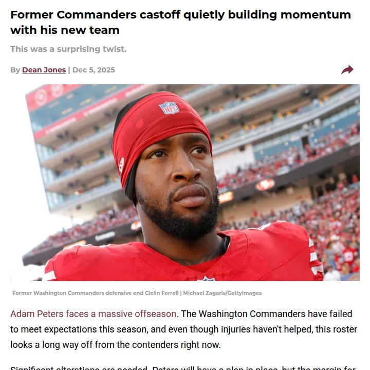 Christopher Hughes+FollowCommanders Regret Letting Ferrell Walk?Clelin Ferrell, once seen as a bust and cut loose by the Commanders, is now making serious noise with the Niners. Since injuries opened the door, Ferrell’s brought real heat off the edge—racking up four sacks in four games and a career-high nine tackles against the Browns. While Washington’s D-line is struggling, Ferrell’s resurgence in San Francisco is turning heads. Did the Commanders give up too soon, or is this just a perfect fit for the former Clemson star? #Sports #Football #49ers00Share
