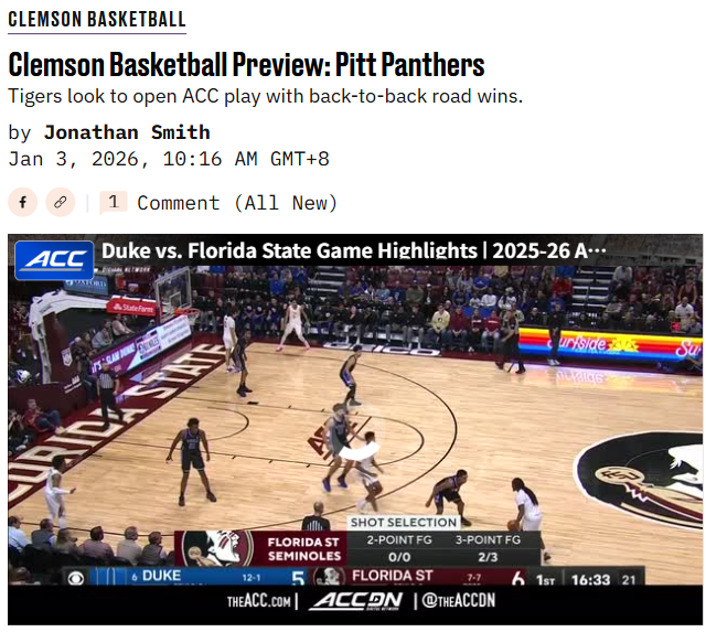 CrimsonChameleon+FollowClemson edges Syracuse in ACC opener thrillerClemson fans got a nail-biter to kick off ACC play as the Tigers pulled off a 64-61 win over Syracuse on New Year’s Eve. RJ Godfrey and Dillon Hunter led the charge, but it was Carter Welling’s clutch free throw and late steal that sealed the deal. Syracuse nearly tied it in the final seconds, but the Tigers’ defense held strong. That’s five straight wins for Clemson over Syracuse since last year! What do you think this win says about Clemson’s chances in the ACC this season? Let’s hear your thoughts! #Sports #ClemsonTigers #ACCbasketball00Share