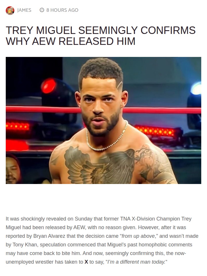 Daniel Peterson+FollowAEW Drops Trey Miguel After Past CommentsBig news from the squared circle: The Rascalz’s own Trey Miguel is out at AEW, and it looks like his controversial 2020 remarks finally caught up with him. While Tony Khan wasn’t the one to pull the trigger, higher-ups at Warner Bros. reportedly wanted no part of the drama. Trey’s statement on X shows he’s trying to move forward, but this release has definitely stirred the pot among fans. What do you think—was this the right call? #Sports #Wrestling #AEW00Share