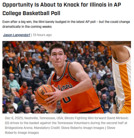 GalacticGiraffe+FollowIllinois hoops: Ready for a rankings leap?Illinois basketball just knocked off Tennessee and sits at No. 13 in the latest AP poll, but fans are buzzing about whether that’s high enough. With a strong non-conference run and only a few tough games ahead, the Illini could be primed for a big jump—if higher-ranked teams slip up. The next stretch is a golden opportunity, especially with Nebraska and Ohio State on deck. Is this the year Illinois finally breaks into the top 10, or are we still waiting for that signature run? Let’s hear your thoughts: is No. 13 fair, or should the Illini be higher? #Sports #IllinoisBasketball #APPoll00Share