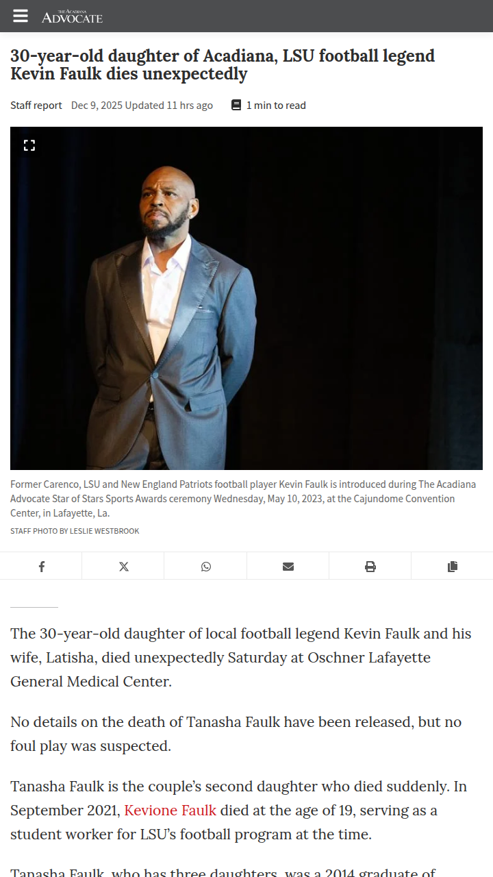 Christopher Hughes+FollowAcadiana mourns with Kevin Faulk’s familyAcadiana is feeling the heartbreak alongside Kevin Faulk and his family after the sudden loss of his 30-year-old daughter, Tanasha Faulk. Many remember Tanasha for her warmth, her love of family gatherings, and the joy she found in being a mom to her three daughters. This tragedy comes just a few years after the Faulks lost their younger daughter, Kevione, in 2021. The community is rallying around the Faulks, who have deep roots here—Kevin’s legendary football career started at Carencro High and LSU. How do you think our community can best support families facing such unimaginable loss? #Sports #Football #Acadiana00Share