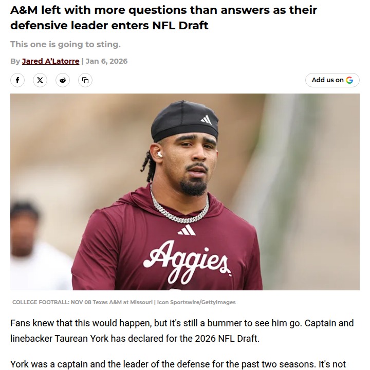 Jay Williams+FollowA&M’s defense faces big shakeup after York’s exitLosing Taurean York to the NFL Draft is more than just a stat sheet hit for Texas A&M—it’s a huge leadership gap. York wasn’t just racking up tackles; he was the heart of the Aggies’ defense, a rare two-time captain as a sophomore. Now, with both York and veteran Scooby Williams gone, Coach Elko has a real challenge ahead. Who steps up to fill those shoes? Aggie fans, how do you see the defense evolving next season—and who do you think will emerge as the new leader? #Sports #Football #Aggies00Share