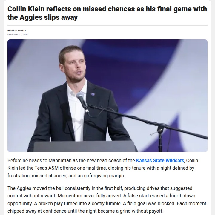 John Camacho+FollowRed zone woes haunt Texas A&M in Klein’s finaleFive yards. That’s all that separated Texas A&M from a different ending in Collin Klein’s last game calling plays for the Aggies. The offense moved the ball but just couldn’t cash in when it mattered—blocked field goals, a crucial fumble, and too many third-and-longs against a relentless Miami defense. Klein praised QB Marcel Reed’s growth, hinting at a bright future, but you could feel the sting of missed chances as this chapter closed. How do you think the Aggies can turn these near-misses into touchdowns next season? #Sports #Football #Aggies00Share