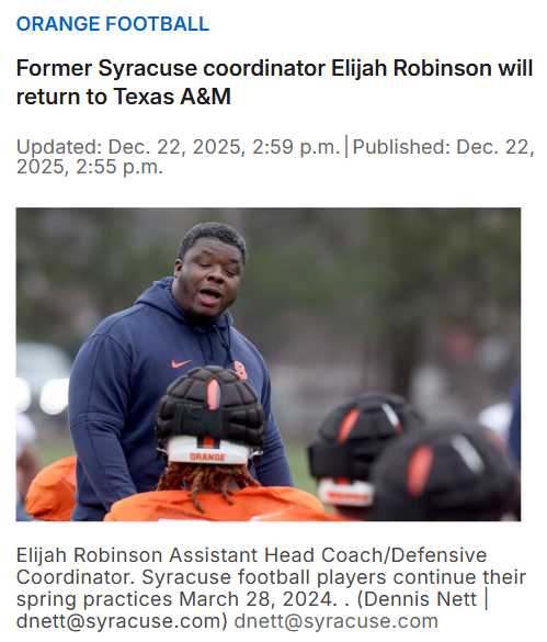 Jeffrey Armstrong+FollowAggies Bring Back Coach E. Rob After SU DramaBig news, Aggies fans! Coach E. Rob is heading back to College Station after a rocky stint with the Orange. After being demoted by Fran Brown following SU’s defensive collapse, Robinson turned down offers from LSU and Nebraska to rejoin Texas A&M as D-line coach. His recruiting chops, especially in the northeast, could be a game-changer for the Aggies. Thoughts on what this means for our defense next season? #Sports #Football #Aggies00Share