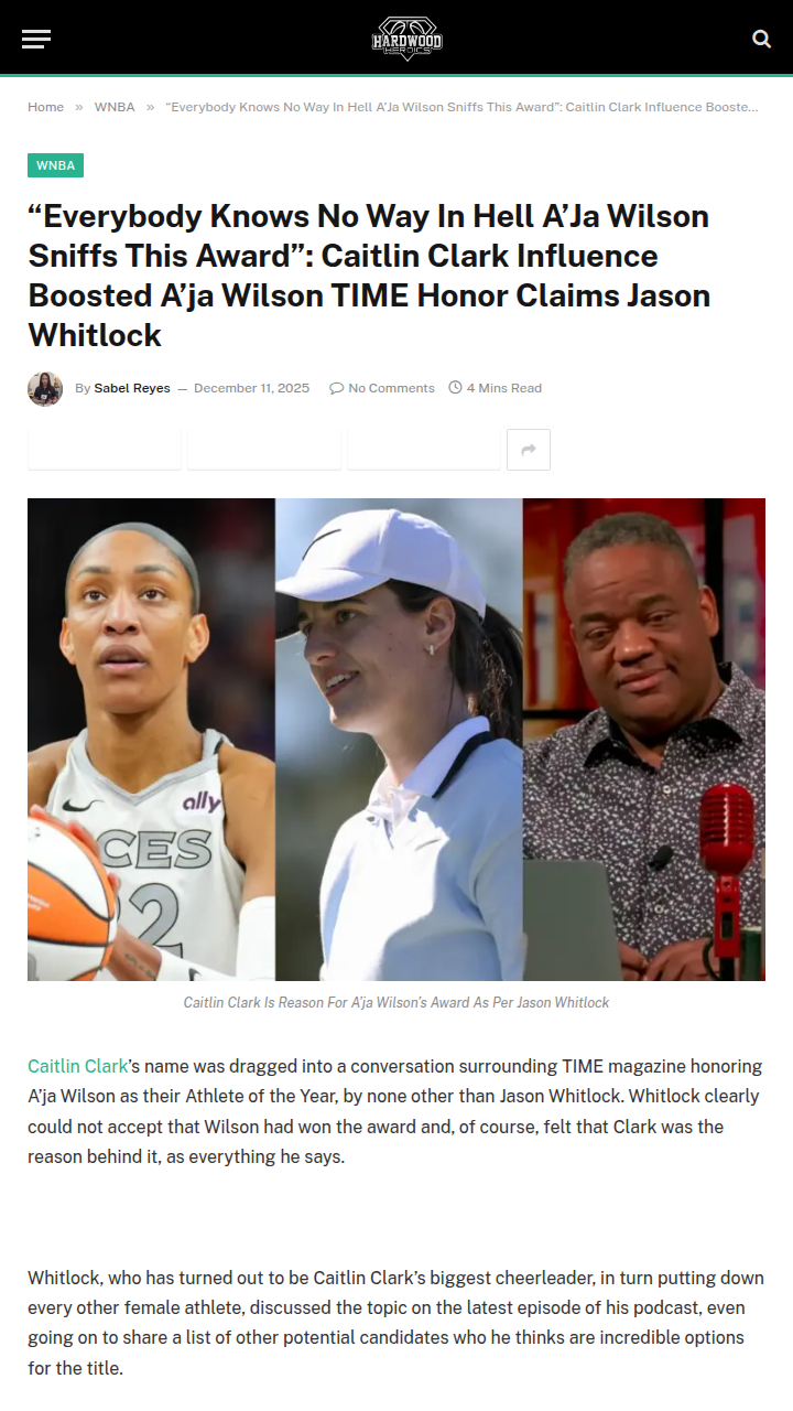 Dawn Fritz+FollowA’ja Wilson’s TIME Win Sparks Clark DebateSo, the Aces’ superstar A’ja Wilson just bagged TIME’s Athlete of the Year, but Jason Whitlock is stirring the pot, claiming she only got the nod thanks to Caitlin Clark’s influence. Whitlock’s basically saying without Clark’s spotlight on the WNBA, Wilson wouldn’t have sniffed the award. Fans are split—some say Wilson’s championship run speaks for itself, others buy Whitlock’s take. Where do you stand on this rivalry? #Sports #Aces #AjaWilson11Share