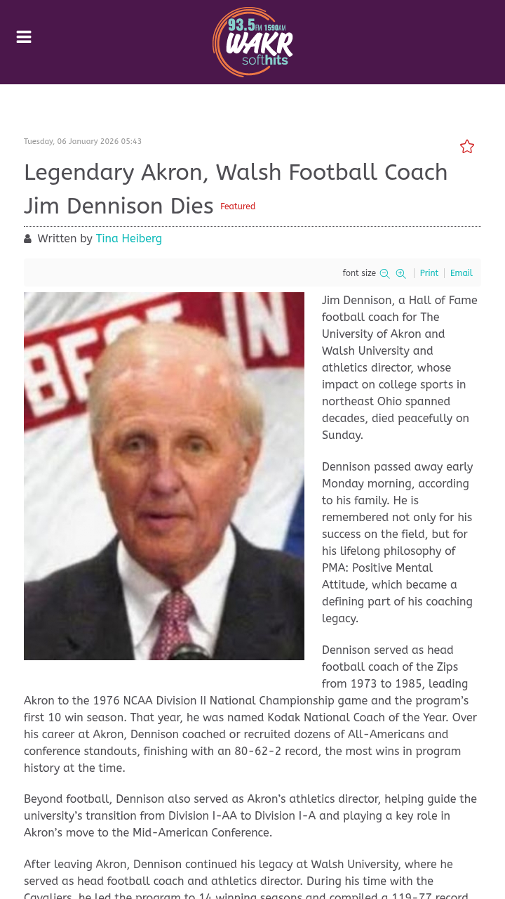 Jay Williams+FollowAkron mourns a true coaching legendJim Dennison’s legacy isn’t just about wins—it’s about shaping generations in Akron and beyond. From leading the Zips to their first 10-win season and a national championship game, to building Walsh University’s football program from scratch, Dennison’s Positive Mental Attitude (PMA) philosophy left a mark on players, colleagues, and the whole community. He was more than a coach; he was a mentor, a neighbor, and a friend. His impact will live on through the scholarship in his name, supporting future student-athletes. How have you seen Dennison’s influence in our community or in your own life? #Sports #Football #Akron00Share