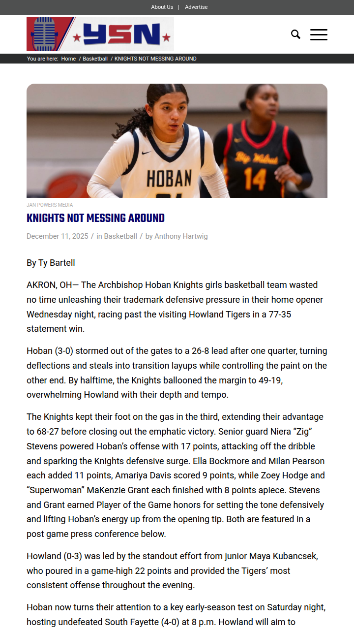 Brian Gaines+FollowAkron’s Hoban Knights dominate home openerThe Archbishop Hoban Knights girls basketball team set the tone for their season with a relentless defensive display, cruising to a 77-35 win over Howland in Akron. From the opening tip, Hoban’s energy was off the charts—turning steals into fast-break points and building a huge lead early. Senior guard Niera “Zig” Stevens led the charge with 17 points, while teammates like Ella Bockmore and Milan Pearson chipped in double digits. The Knights’ depth and tempo were just too much for Howland to handle. With another big matchup coming up, can Hoban keep this momentum rolling? #Sports #Basketball #Akron00Share