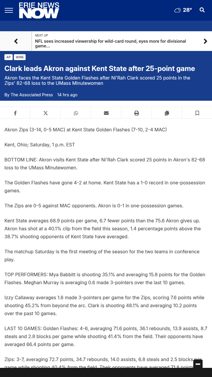 Oscar Gonzalez+FollowAkron vs Kent State: Rivalry heats up SaturdayNi'Rah Clark just dropped 25 points, and now Akron heads into a big showdown with Kent State. Even though the Zips are struggling in the MAC, Clark’s hot streak could shake things up. Kent State has been tough at home, but Akron’s shooters are quietly improving. Both teams are hungry for a win, and this is their first conference clash of the season. With local pride and bragging rights on the line, who do you think will step up? Let’s hear your predictions and what you’re watching for in this rivalry matchup! #Sports #Basketball #AkronZips00Share