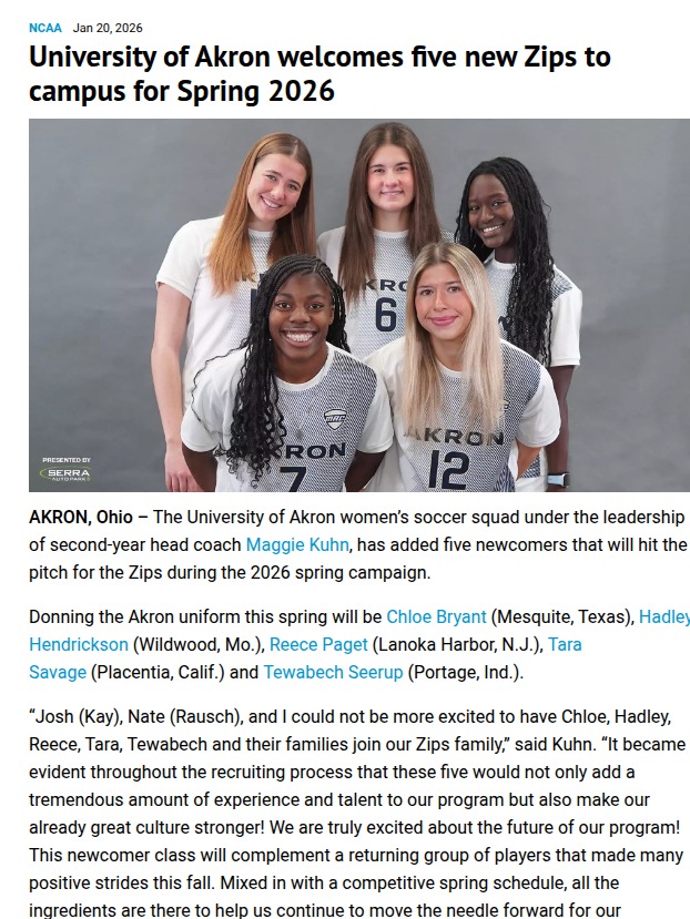 Allison Travis+FollowMeet Akron’s newest women’s soccer starsBig changes are coming to the University of Akron’s women’s soccer team this spring! Five new players from all over the country—Texas, Missouri, New Jersey, California, and Indiana—are joining the Zips, bringing fresh energy and experience. Coach Maggie Kuhn says this group will boost the team’s culture and help push the program forward. With talent from top college programs and elite club teams, these newcomers are set to make an immediate impact. What do you think this new lineup means for the Zips’ chances next season? Let’s welcome them and talk about what’s next for Akron soccer! #Sports #Soccer #AkronZips00Share