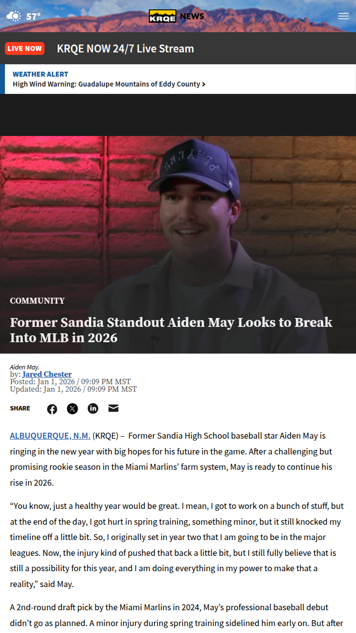 Cassandra Reed+FollowAiden May’s MLB dream heats up in AlbuquerqueAiden May, once a Sandia High School standout, is making waves as he eyes a shot at the big leagues in 2026. After a tough rookie year in the Marlins’ farm system—set back by a spring injury—May’s comeback has been all about grit and growth. He’s holding hitters to a .147 average and getting honest feedback that’s fueling his drive. Now, heading into spring training at full strength, May’s determination is stronger than ever. What do you think—can this Albuquerque native defy the odds and make his MLB debut this year? Let’s hear your thoughts! #Sports #Baseball #Albuquerque00Share