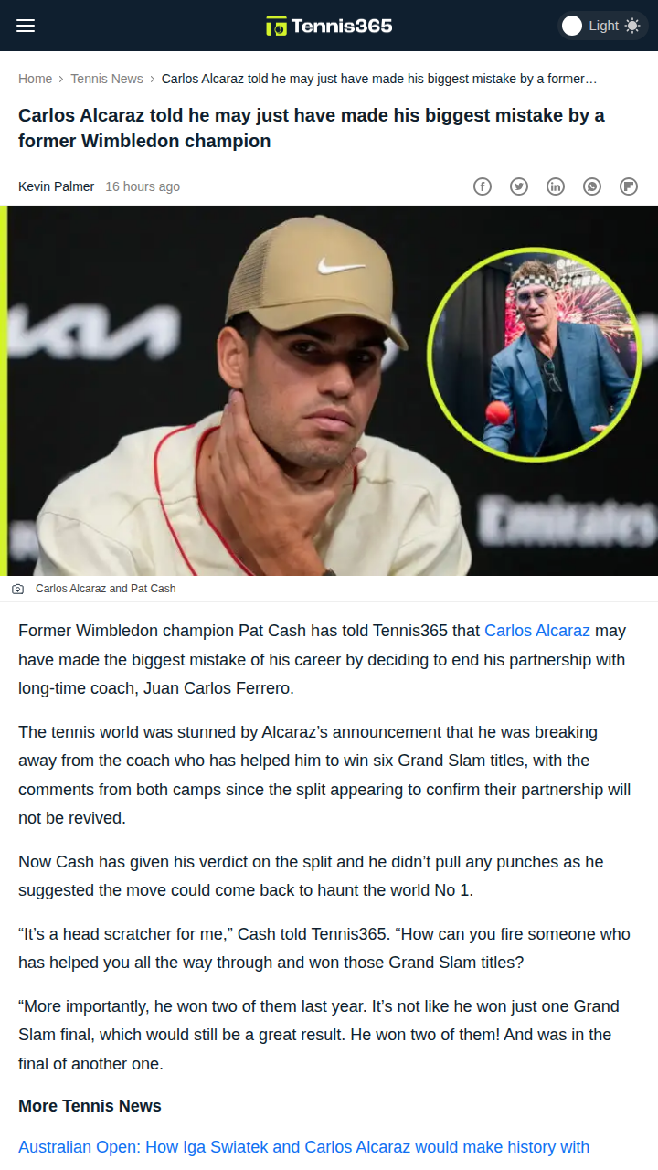 Danielle Strickland+FollowAlcaraz Splits with Ferrero: Right Move or Risky Play?Wow, tennis fans—Carlos Alcaraz just dropped a bombshell by parting ways with his long-time coach, Juanki Ferrero, right after his best season yet! Even Pat Cash is scratching his head, calling it possibly King Carlos’ biggest mistake. With the Aussie Open coming up, will this bold move fire him up or throw him off his game? Let’s hear your takes: is this a new era or a risky gamble for the world No. 1? #Sports #Tennis #Alcaraz00Share