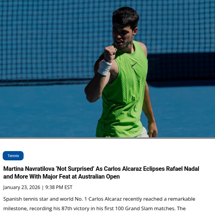 Nicholas Henderson+FollowAlcaraz Ties Borg, Surpasses Rafa at AO!Wow, Carlitos just keeps rewriting the history books! With his latest win at the Aussie Open, Alcaraz now boasts 87 victories in his first 100 Grand Slam matches—matching the legendary Björn Borg and moving ahead of Rafa and McEnroe. Even Martina Navratilova isn’t shocked, saying he’s been the full package since day one. Do you think Alcaraz is on track to be the next King of the Slams? #Sports #Tennis #Alcaraz00Share