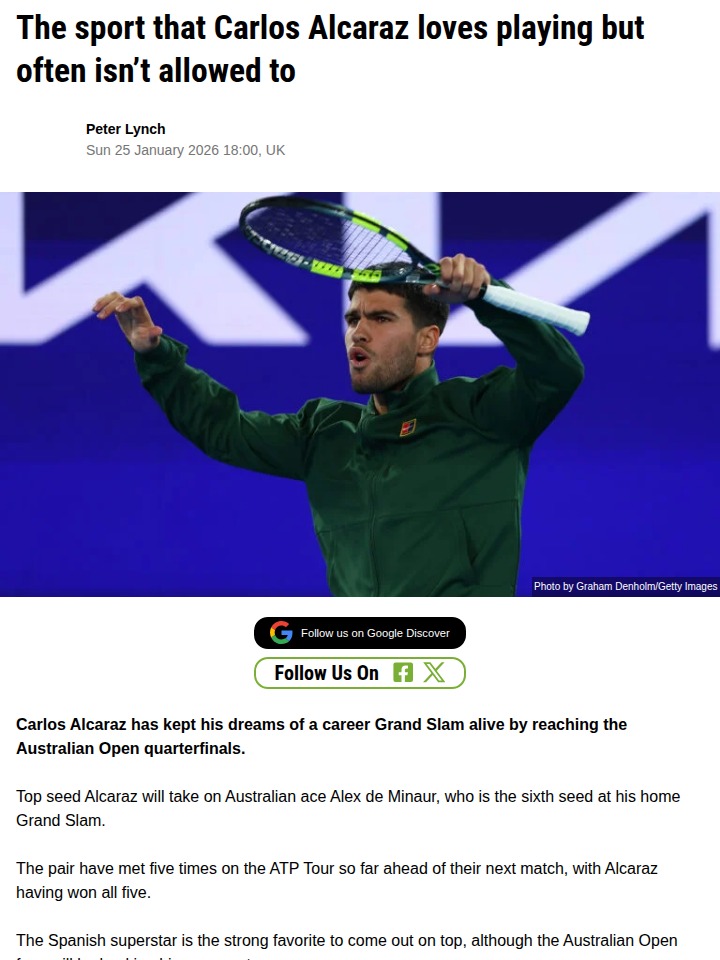 Nicole Baxter+FollowAlcaraz Eyes Aussie Open Glory vs DemonHow about Carlitos keeping his Grand Slam dream alive Down Under? The Matador faces the Demon (De Minaur) in the Aussie Open quarters, and he's 5-0 against him on tour! The crowd will be wild for their home hero, but King Carlos is the favorite. Fun fact: Alcaraz is a huge padel fan, but his team sometimes bans him from playing to avoid injuries. Also, loved his banter with Nole about copying that serve! Who's got the edge in this rivalry? #Sports #Tennis #Alcaraz00Share