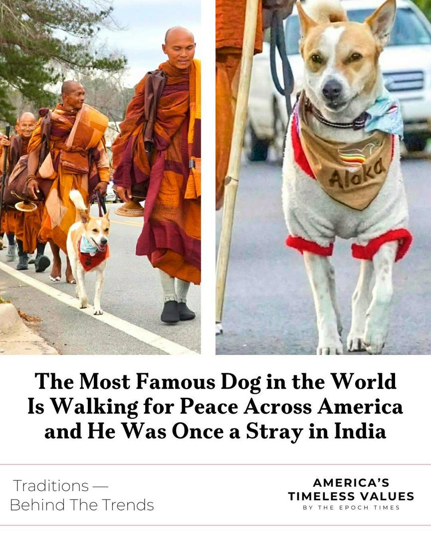 Aloka was once a stray in India, roaming the streets with no home. That was until he crossed paths with a group of Buddhist monks on a peace walk. He chose to join them, and a special bond formed.