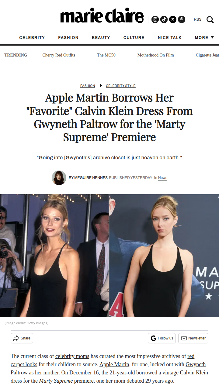 Cory Weaver+FollowApple Martin Rocks Gwyneth’s Iconic DressApple Martin just proved raiding your mom’s closet is a power move! She hit the Marty Supreme premiere in NYC wearing Gwyneth Paltrow’s vintage Calvin Klein dress from 1996, and honestly, she looked like her mom’s twin. Apple’s soft glam and chic updo gave the throwback look a modern twist. She’s obsessed with Gwyneth’s ‘90s fashion and says her mom totally encourages the closet raids. Can you imagine having that archive to play with? #Beauty #AppleMartin #GwynethPaltrow10Share
