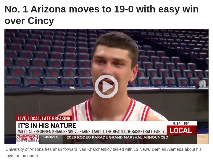 Ryan Lopez+FollowArizona Wildcats keep rolling at McKaleArizona’s basketball team just notched their 19th straight win, dominating Cincinnati 77-51 in front of a buzzing Tucson crowd. Motiejus Krivas nearly hit a double-double, and the Wildcats out-rebounded, out-assisted, and out-hustled Cincy in every stat that matters. It’s wild to see this kind of streak—especially with so many players stepping up each game. For Tucson locals, the energy around the Wildcats is electric right now. How far do you think this team can go this season? Share your thoughts on Arizona’s run and what it means for the city! #Sports #Basketball #ArizonaWildcats00Share