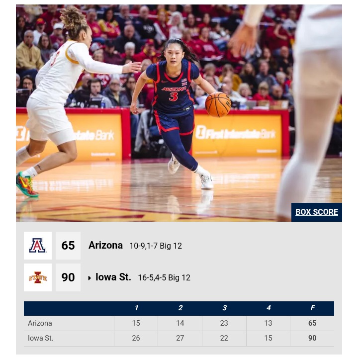 Ryan Lopez+FollowWildcats’ wild finish: Only four left on the court!Arizona’s women’s basketball team ended their game at Iowa State with just four players on the floor after five Wildcats fouled out—talk about a test of grit! Even with the odds stacked, Noelani Cornfield dropped 19 points and Sumayah Sugapong kept her double-digit streak alive. The team’s hustle in the third quarter was impressive, but foul trouble finally caught up to them in the fourth. Have you ever seen a team finish a game so shorthanded? What would you do as a coach in that situation? Let’s hear your thoughts on how the Wildcats handled the chaos! #Sports #Basketball #ArizonaWildcats00Share