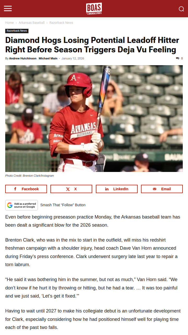 Maria Chavez+FollowArkansas outfield shaken up after Clark injuryLosing Brenton Clark before preseason even starts is a gut punch for Arkansas baseball fans. Clark was set to be a spark at the top of the lineup, coming off a red-hot fall and a summer where he hit .359 with the Foresters. Now, after shoulder surgery, he’s sidelined until 2027—echoing the tough breaks we’ve seen with Razorback aces in recent years. With Clark out, the outfield picture is wide open. Transfers like Maika Niu and Damian Ruiz, plus returners like Kuhio Aloy, will have to step up. How do you see this reshaped outfield impacting the Hogs’ season? #Sports #Baseball #ArkansasBaseball10Share