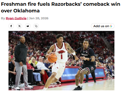 summersivan+FollowRazorbacks’ freshmen shine in clutch winArkansas fans just witnessed something special—freshmen Meleek Thomas and Darius Acuff Jr. stepped up under serious pressure to seal a gritty road win over Oklahoma. Thomas iced the game with cool confidence at the free-throw line, while Acuff Jr. led the team with 21 points and nine assists. That’s two SEC road wins in January, a huge boost for the Razorbacks’ NCAA Tournament hopes. It’s wild to see such poise from first-year players, and it feels like this team is building something big. How do you feel about trusting the game to freshmen in crunch time? #Sports #Basketball #ArkansasBasketball00Share