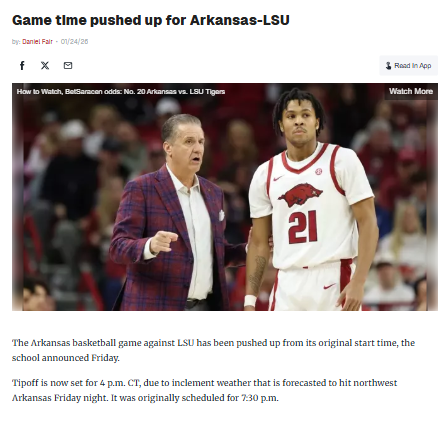 guerrajohn+FollowArkansas-LSU hoops game time moved upWeather is shaking up game day plans in northwest Arkansas—Arkansas vs. LSU basketball is now tipping off at 4 p.m. CT instead of the original 7:30 p.m. slot. The shift comes as storms are expected to roll in Friday night, but fans can still catch all the action on the SEC Network. How do you feel about the earlier start? Will this change your plans to watch or attend? Let’s hear how this impacts your Friday! #Sports #Basketball #ArkansasBasketball00Share