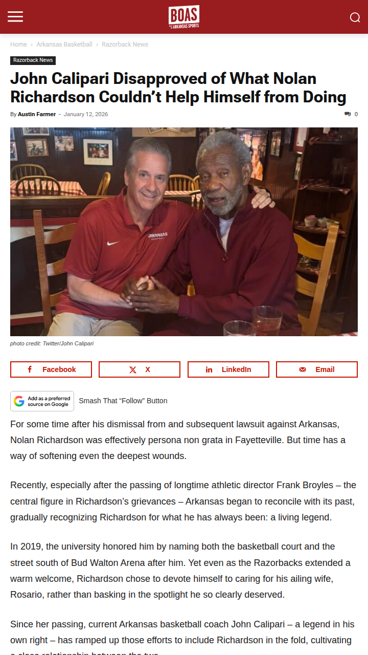 summersivan+FollowHow Nolan Richardson’s legacy is shaping Arkansas hoopsNolan Richardson, once at odds with Arkansas, is now being embraced as the legend he is. After years of tension, the university named the basketball court and a street after him, but Richardson chose to care for his wife instead of stepping into the spotlight. Since her passing, new coach John Calipari has made it a point to bring Richardson back into the Razorbacks’ family, even seeking his advice on defense. It’s wild to see Calipari, a coaching icon himself, showing so much respect and superstition—especially about things like Final Four tickets and even raisins in oatmeal! What do you think about honoring legends and blending old-school wisdom with new leadership? #Sports #Basketball #ArkansasBasketball00Share