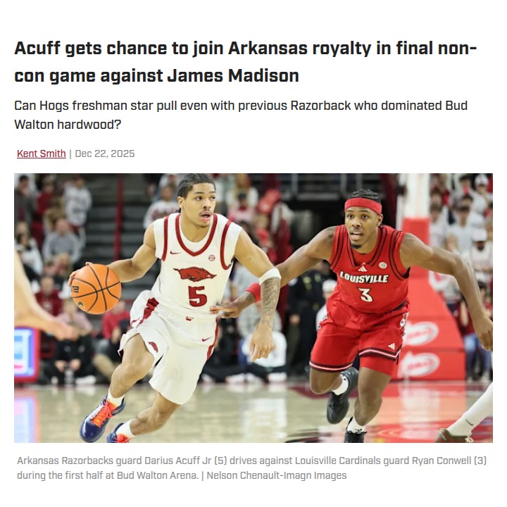 summersivan+FollowDarius Acuff’s electric run lifts Arkansas hoopsDarius Acuff is rewriting what it means to be a freshman for Arkansas basketball. He’s just picked up his third straight SEC Freshman of the Week honor, putting up monster numbers against both top teams and tough defenses. Acuff’s mix of scoring, assists, and clutch plays has made him a nightmare for opponents and a thrill for fans. With one more non-conference game left, he’s on the verge of tying an Arkansas record for double-digit scoring to start a career. Can he keep this streak alive and join Razorback royalty? Let’s hear your predictions! #Sports #Basketball #ArkansasBasketball00Share