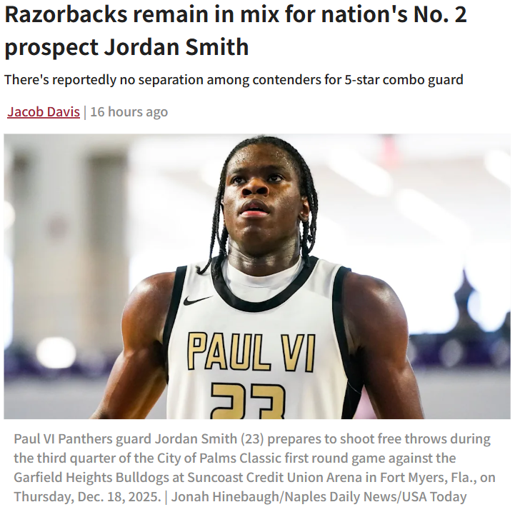 CrimsonChameleon+FollowJordan Smith’s decision could shake up Arkansas hoopsJordan Smith Jr.—the nation’s No. 2 basketball prospect—has Arkansas fans buzzing as he nears his college choice. After an “eye-opening” visit to Fayetteville and some serious attention from Coach Calipari, Smith is still keeping everyone guessing. His game is electric: 40 points in a single tournament game, elite defense, and a wingspan that changes everything on the court. With powerhouse programs like Duke and Kentucky also in the mix, Smith’s decision could be a game-changer for the Razorbacks. How would landing a player like Smith impact Arkansas basketball’s future? #Sports #ArkansasBasketball #JordanSmith00Share