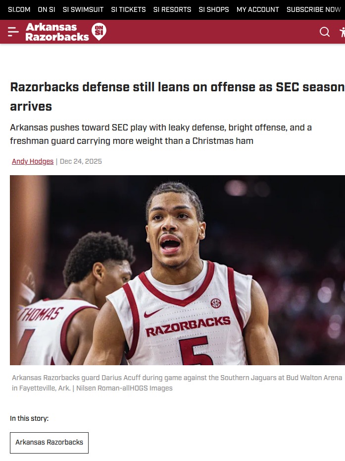 Christopher Hughes+FollowRazorbacks’ defense: The big SEC questionArkansas fans know the Razorbacks can light up the scoreboard, but defense is still the wild card as SEC play kicks off. Darius Acuff Jr. has been a revelation, leading the offense with poise beyond his years, while Trevon Brazile’s ups and downs seem to set the team’s ceiling. The real test? Whether this squad can finally lock in on defense for a full 40 minutes. Offense wins games, but defense wins the SEC. Do you think the Hogs can put it all together, or will defensive lapses hold them back? #Sports #Football #ArkansasBasketball00Share