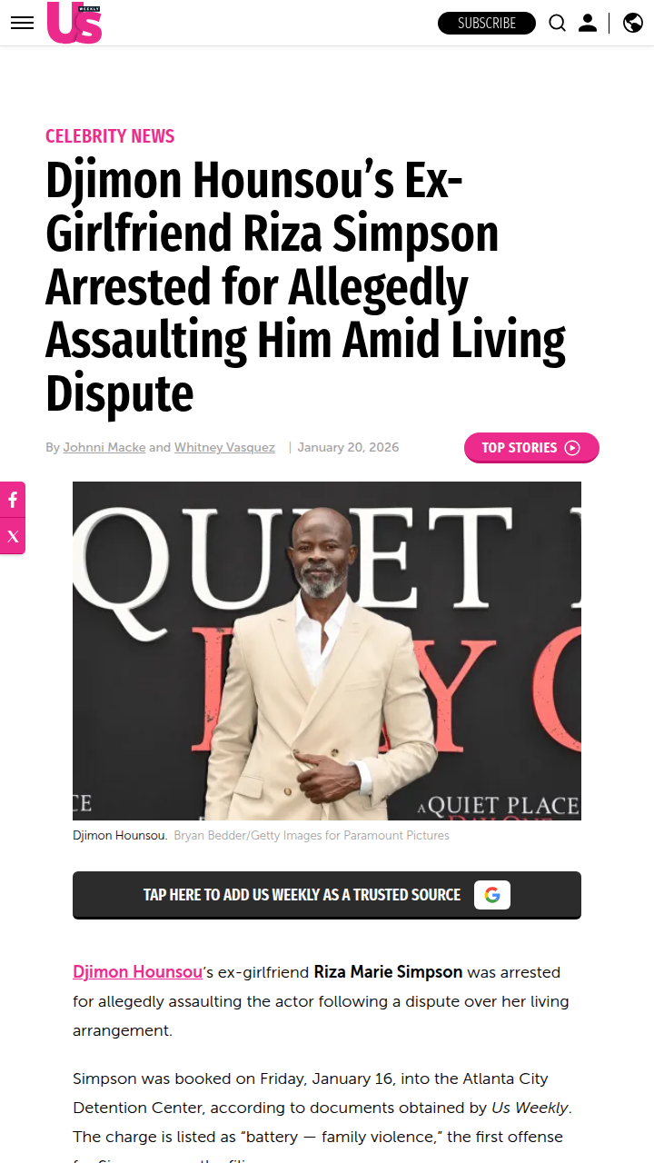 Gina Reynolds+FollowDjimon Hounsou’s family drama rocks AtlantaAtlanta just saw a shocking twist in the life of Oscar-nominated actor Djimon Hounsou. His ex-girlfriend, Riza Simpson, was arrested after an alleged assault during a heated dispute over her living situation. What’s even more intense: their kids were home during the altercation, though they didn’t see it happen. Hounsou says he’s still struggling financially in Hollywood despite his success, adding another layer to this already complicated story. How do you think fame and personal struggles intersect, especially when kids are involved? Let’s talk about the real-life challenges behind the headlines. #Entertainment #Celebrity #Atlanta50Share