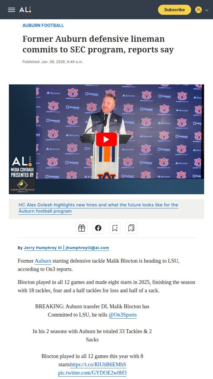 Amy Williams+FollowBlocton Bolts: Auburn-LSU Rivalry Heats UpBig news, Tiger and Tiger fans! Malik Blocton, the former Auburn D-line anchor, is taking his talents to LSU for Lane Kiffin’s debut season. After starting 8 games and helping Auburn’s D rank 12th nationally vs the run, Blocton’s move adds major fuel to the Auburn-LSU rivalry. Circle Oct. 24—this SEC clash just got personal! #Sports #Football #Auburn00Share